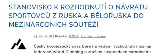 The Czech Mountaineering Association (ČHS) acknowledges the decision of the World Climbing Federation to allow athletes from Russia and Belarus to return to international competitions under neutral status, but disagrees with this move. The association stated this in a statement in response to the decision of the World Climbing Executive Committee. ... full story